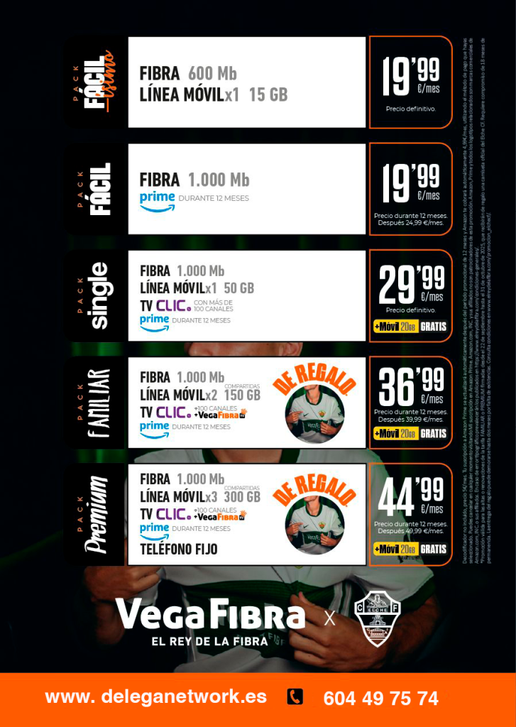 Solo tienes que contratar uno de los packs Familiar o Premium disponibles en www.deleganetwork.es , visitarnos en C/Jorge Juan,14 de Elche o llamar al 604 49 75 74. Una vez activado tu servicio, recibirás la camiseta oficial del Elche CF como parte de la promoción.